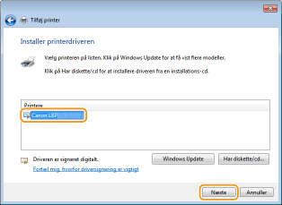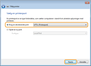 Kontroller, at [LPT1] er valgt under [Brug en eksisterende port], og klik på [Næste].