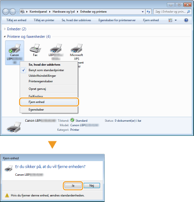 Når du er færdig med at installere netværksprinteren, er der ikke længere brug for ikonet, der blev tilføjet i trin 13 af Installering af en printerdriver. For at slette ikonet skal du højreklikke på det og vælge [Fjern enhed] eller [Slet]  klik på [Ja].