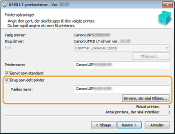 Hvis du anvender en printer, der er tilsluttet med USB, kan du ikke konfigurere en printserver på det tidspunkt, du installerer printerdriveren. Konfigurer printserveren, efter du har installeret printerdriveren, ved at anvende den fremgangsmåde, der er beskrevet ovenfor.