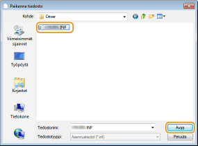 Määritä kansio, johon tulostinajuri on tallennettu, valitse Inf-tiedosto ja valitse [Avaa].