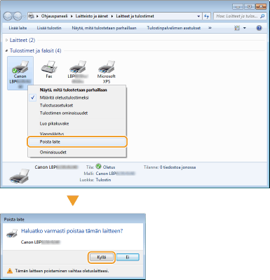 Kun verkkotulostin on asennettu, kohdan Tulostinajurin asentaminen vaiheessa 13 lisättyä kuvaketta ei enää tarvita. Kun haluat poistaa kuvakkeen, napsauta sitä hiiren kakkospainikkeella ja valitse [Poista laite] tai [Poista]  valitse [Kyllä].