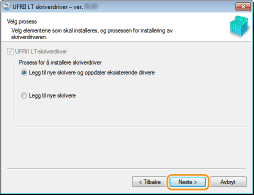 Hvis en skriverdriver allerede er installert, vises skjermbildet [Velg prosess] før skjermbildet [Velg skrivere som skal installeres]. Valget du tar her har ingen innvirkning på konfigurasjonsprosessen for skriveren. Klikk ganske enkelt på [Neste]. ![]() Hvis kategorien [IPv6-enheter] ikke vises