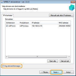 Velg avmerkingsboksen [Angi skriverinformasjon] og klikk så på [Neste].