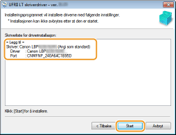 Sjekk skriverinformasjonen i [Skriverliste for driverinstallasjon] og klikk på [Start].