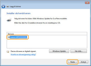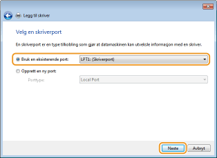 Sørg for at [LPT1] er valgt under [Bruk en eksisterende port] og klikk så på [Neste].
