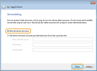 Velg [Ikke del denne skriveren] og klikk så på [Neste].