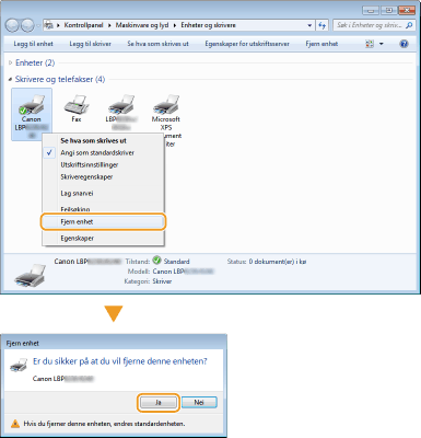 Når du har fullført installasjonen av nettverksskriveren, er ikonet som ble lagt til i trinn 13 i Installere en Skriverdriver ikke nødvendig lenger. Høyreklikk på dette ikonet når du vil slette det, og klikk på [Fjern enhet] eller [Slett]  og klikk på [Ja].
