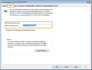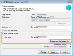 Når dette er valgt, vil datamaskinen som skriverdriveren installeres på bli utpekt som utskriftsserver. [Delt navn]