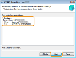 Sjekk skriverinformasjonen i [Skriverliste for driverinstallasjon] og klikk på [Start].
