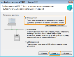 Выберите [Стандартная], установите флажок [Вывод принтеров из режима ожидания и поиск] и нажмите [Далее].