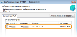 Если драйвер принтера уже установлен, окно [Процесс выбора] отображается перед окном [Выберите принтеры для установки]. В данном случае выбранный здесь вариант не имеет значения для процесса установки принтера. Просто нажмите [Далее]. ![]() Если вкладка [Устройства IPv6] не отображается