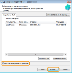 Установите флажок [Введите информацию о принтере] и нажмите [Далее].