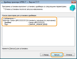 Проверьте информацию о принтере в списке [Список принтеров для установки драйвера] и нажмите [Запуск].