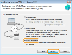 Когда отображается следующее окно, соедините компьютер и принтер USB-кабелем (Подключение через USB) и включите принтер.