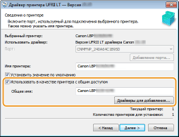 Когда флажок установлен, компьютер, на котором устанавливается драйвер принтера, назначается сервером печати. [Общее имя]