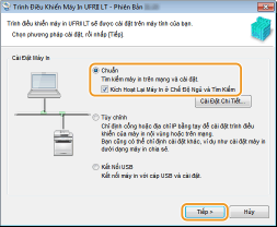 Chọn [Chuẩn], chọn hộp kiểm tra [Kích Hoạt Lại Máy In ở Chế Độ Ngủ và Tìm Kiếm], và bấm [Tiếp].
