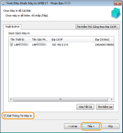 Chọn hộp kiểm tra [Đặt Thông Tin Máy In], và bấm [Tiếp].