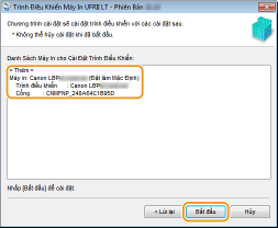 Kiểm tra thông tin máy in trong [Danh Sách Máy In cho Cài Đặt Trình Điều Khiển], và bấm [Bắt đầu].