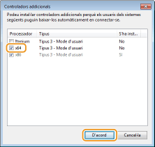 Feu clic aquí per instal·lar controladors addicionals. Durant el procediment explicat a Instal·lació de controladors mitjançant el servidor d'impressió (Opcions de client), calen controladors addicionals si voleu utilitzar el servidor d'impressió per instal·lar controladors d'impressora en ordinadors que utilitzin versions diferents de processador (32 bits o 64 bits) del sistema operatiu. |
