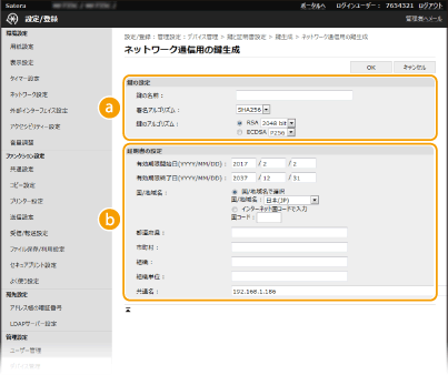 Transport Layer Security(TLS)を使った暗号化通信に必要な鍵と証明書を生成できます。TLSは、リモートUIを使って本機にアクセスするときに使用できます。「ネットワーク通信用」に生成した鍵と証明書では自己署名証明書が使われます。