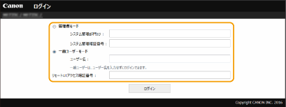 リモートUI のすべての操作および設定ができます。システム管理部門IDを設定している場合は、[システム管理部門ID]と[システム管理暗証番号]を入力してください。