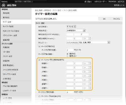 *指定した時刻に電源を切ることができなかったときは、1 分ごとに最大 10 回まで再試行します。それでも電源を切ることができなかった場合、その日は自動的に電源が切られません。
