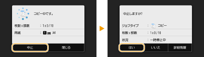 <スタート>を選んだ直後にコピーを中止するときは、画面から<中止>を選ぶか、操作パネルの