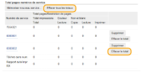 Pour remettre un compteur à zéro, cliquez sur le lien correspondant figurant sous [Numéro de service], puis cliquez sur [Effacer le total]  [OK]. Pour réinitialiser les compteurs de tous les numéros de service, cliquez sur [Effacer tous les totaux]  [OK].