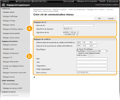 Il est possible de générer une clé avec certificat sur l'appareil lorsque celle-ci est nécessaire pour les communications cryptées via TLS (Transport Layer Security). Vous pouvez faire appel à TLS lors de l'accès à l'appareil depuis l'interface utilisateur distante. Des certificats auto-signés sont utilisés avec la clé avec certificat générée dans "Communication réseau".