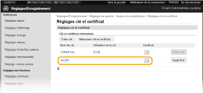 Il est impossible de supprimer une clé avec certificat en cours d'utilisation pour une fonction, comme par exemple lorsque "[TLS]" ou "[IEEE 802.1X]" s'affiche sous [Utilisation de la clé]. Dans un tel cas, désactivez la fonction ou remplacez la clé avec certificat utilisée avant de la supprimer.
