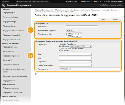 Comme les certificats générés sur l'appareil ne portent pas de signature CA, une erreur de communication peut se produire avec certains périphériques avec lesquels l'appareil communique. Pour qu'une autorité de certification émette le certificat avec une signature CA, vous devez obtenir les données de demande de signature de certificat (CSR), que l'administrateur peut générer depuis l'interface utilisateur distante. Une fois le certificat émis, enregistrez-le sur la clé générée avec la demande CSR.