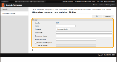 Vous pouvez utiliser l'ordinateur pour enregistrer des destinataires dans le carnet d'adresses de l'appareil, puis modifier les informations des destinataires enregistrés. Configurez le dossier partagé ou l'adresse du serveur FTP ici.