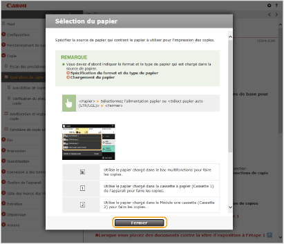 Lorsque vous cliquez sur l'icône, il peut arriver que la page affichée devienne noire et qu'une fenêtre contextuelle s'affiche. Pour revenir sur la page, cliquez sur [Fermer] dans la fenêtre contextuelle.