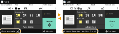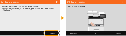 Dans certains cas, lorsqu'une erreur se produit, les instructions permettant d'y remédier s'affichent. Suivez ces instructions pour corriger l'erreur. L'écran apparaissant en cas de bourrage papier est reproduit ci-après à titre d'exemple.