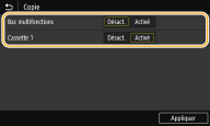 Sélectionnez toujours <Activé> pour au moins l'une des cassettes à papier. Si vous sélectionnez <Désact.> pour toutes les cassettes à papier, vous ne pourrez pas terminer la procédure de réglage.