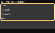 Activez ou désactivez la fonction de sélection automatique de l'alimentation papier pour chaque alimentation papier. Si cette fonction est réglée sur <Activé>, l'appareil sélectionne automatiquement une alimentation papier contenant du papier avec le format approprié pour chaque tâche d'impression. En outre, lorsque tout le papier de l'alimentation papier est consommé, ce réglage permet de poursuivre l'impression en passant à une autre alimentation papier chargée avec du papier de même format.