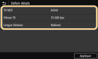 Vous pouvez également spécifier <TX MCE> et <Vitesse TX> depuis <Menu>