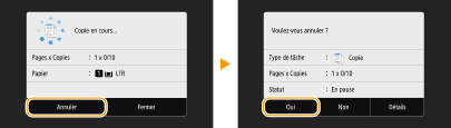 Si vous voulez annuler la copie immédiatement après avoir appuyé sur <Démarrer>, sélectionnez <Annuler> à l'écran ou appuyez sur  sur le panneau de commande. Vous êtes pouvez également annuler la copie après avoir examiné l'état de la copie.