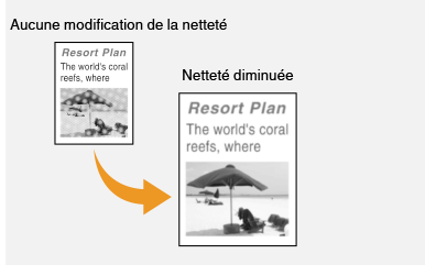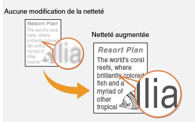 Vous pouvez ajuster la netteté de l'image copiée. Augmentez la netteté pour améliorer la netteté d'un texte flou ou de lignes floues et diminuez-la pour améliorer l'apparence de photos de magazine.