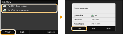 <Suivi statut>  <Tâche TX> Sélectionnez le document à copier dans l'onglet <Statut des tâches TX>  <Annuler> <Oui>