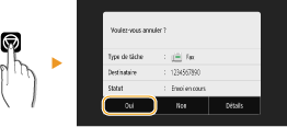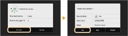 Si vous souhaitez annuler l'envoi de fax immédiatement après avoir sélectionné <Démarrer>, sélectionnez <Annuler> sur l'écran, ou bien appuyez sur , sur le panneau de commande. Vous pouvez également annuler l'envoi de fax après avoir consulté son statut.
