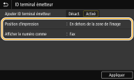 Sélectionnez <Activé> dans <Ajouter ID terminal émetteur>