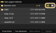 ![]() Lorsque vous sélectionnez <Date/Heure (Croissant)> ou <Date/Heure (Décroissant)>, le classement des fichiers s'effectue selon la date et de l'heure de modification des fichiers.