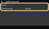 Sélectionnez <Activé> pour imprimer en mode Économie de toner. Sélectionnez <Activé> si vous souhaitez vérifier la mise en page ou d'autres caractéristiques graphiques avant de procéder à l'impression définitive d'une tâche de grande ampleur. ![]() Si <Économie de toner> est réglé sur <Activé>, l'option <Densité> n'est pas disponible.