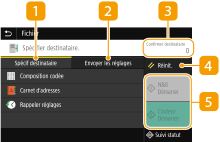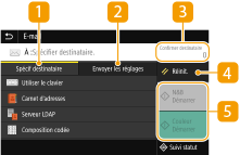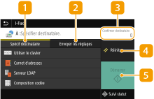 Sélectionnez cet onglet pour rechercher un destinataire enregistré dans le carnet d'adresses ou un serveur LDAP, saisir un numéro de composition codée ou spécifier un destinataire à l'aide de la fonction Rappeler réglages.