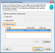 Sélectionnez [Détection auto], sélectionnez l'appareil dès qu'il est détecté, puis cliquez sur [Suivant].