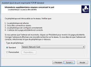 Il s'agit d'un port Windows standard. Lorsque vous utilisez ce type de port, vous devez ajouter un nouveau port dès que l'adresse IP de l'appareil est modifiée. Sélectionnez ce type de port lorsque vous utilisez l'appareil dans un environnement IPv6 et lorsque vous ne pouvez pas ajouter un port MFNP.