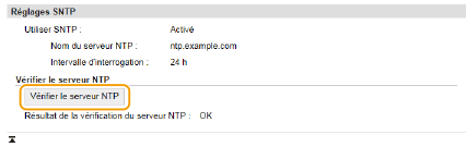 Test des communications avec le serveur NTP/SNTPVous pouvez afficher l'état des communications avec le serveur enregistré en cliquant sur [Réglages/Enregistrement]