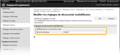 Cochez la case pour définir l'appareil de sorte qu'il réponde aux paquets de découverte de multidiffusion et permette la surveillance par le logiciel de gestion des périphériques. ![]() Pour modifier le numéro de port de découverte multidiffusion, reportez-vous à la section Modification des numéros de port.