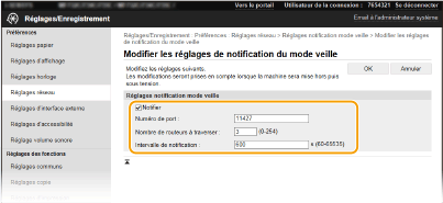 Cochez la case pour signaler au logiciel de gestion des périphériques l'état de l'alimentation de l'appareil. Si [Notifier] est coché, vous constaterez que l'appareil n'établit pas de communications inutiles en mode veille et réduit sa consommation électrique totale. [Numéro de port]